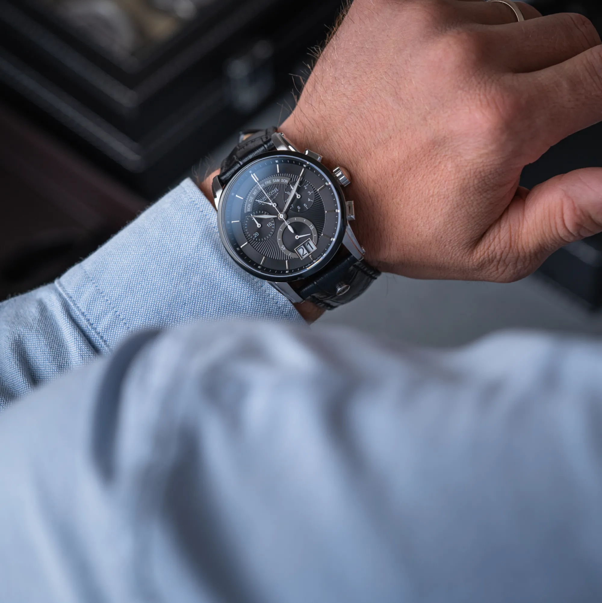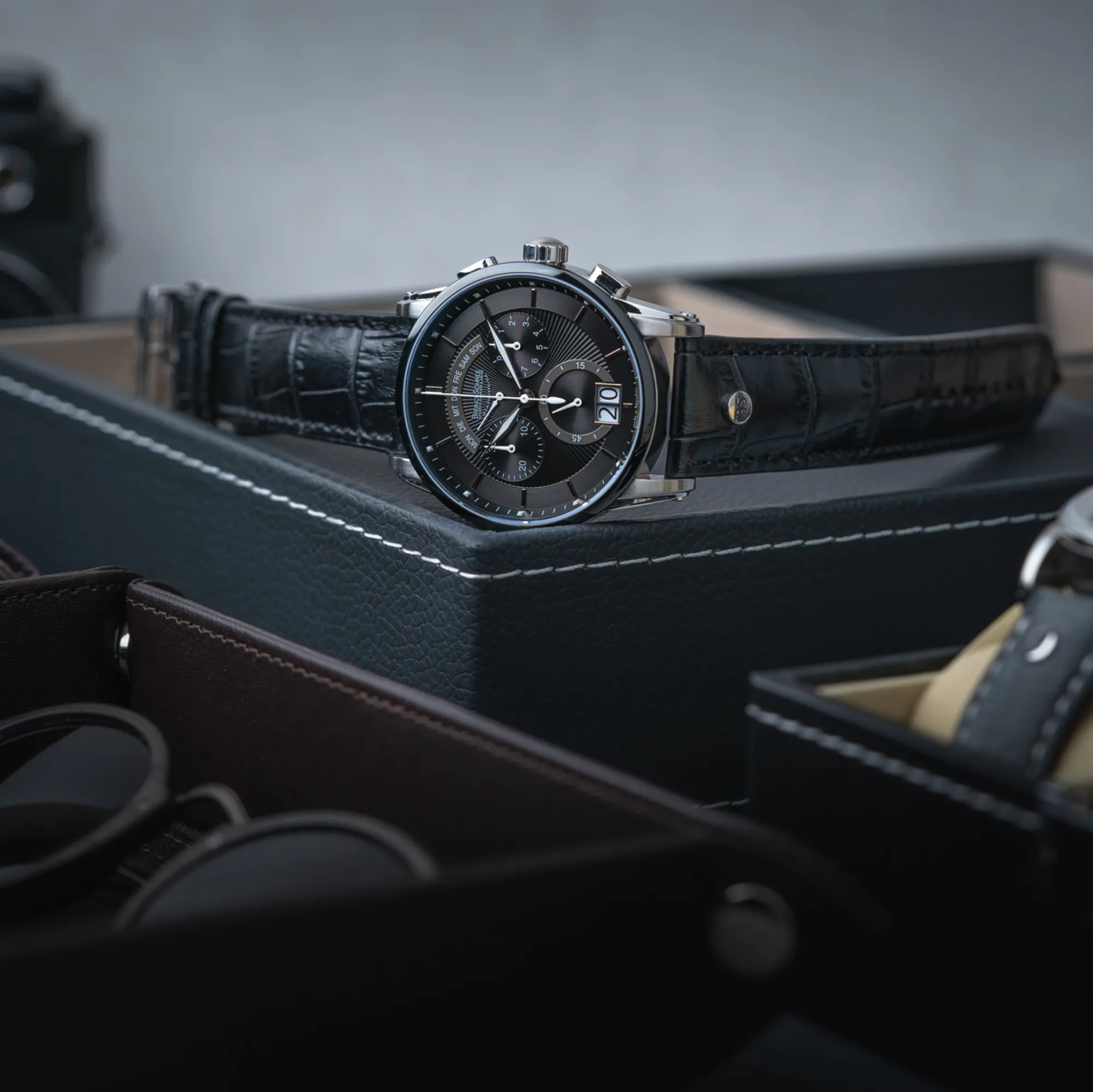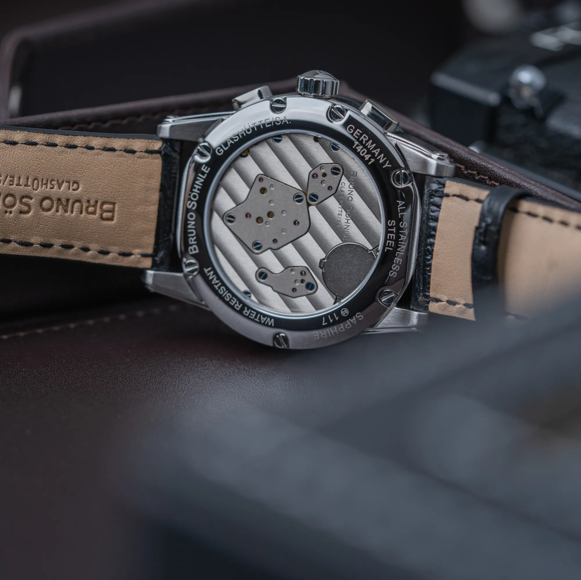 Quarzwerk In Veredelter Bruno Sohnle-Ausfuhrung (Basiswerk Ronda 8040.N), Edelstahl Bicolor Ip Schwarz, O 42,5 Mm, Hohe 12,8 Mm, 10 Bar, Saphirglas Innen Entspiegelt, Rindsleder Schwarz, Faltschliese