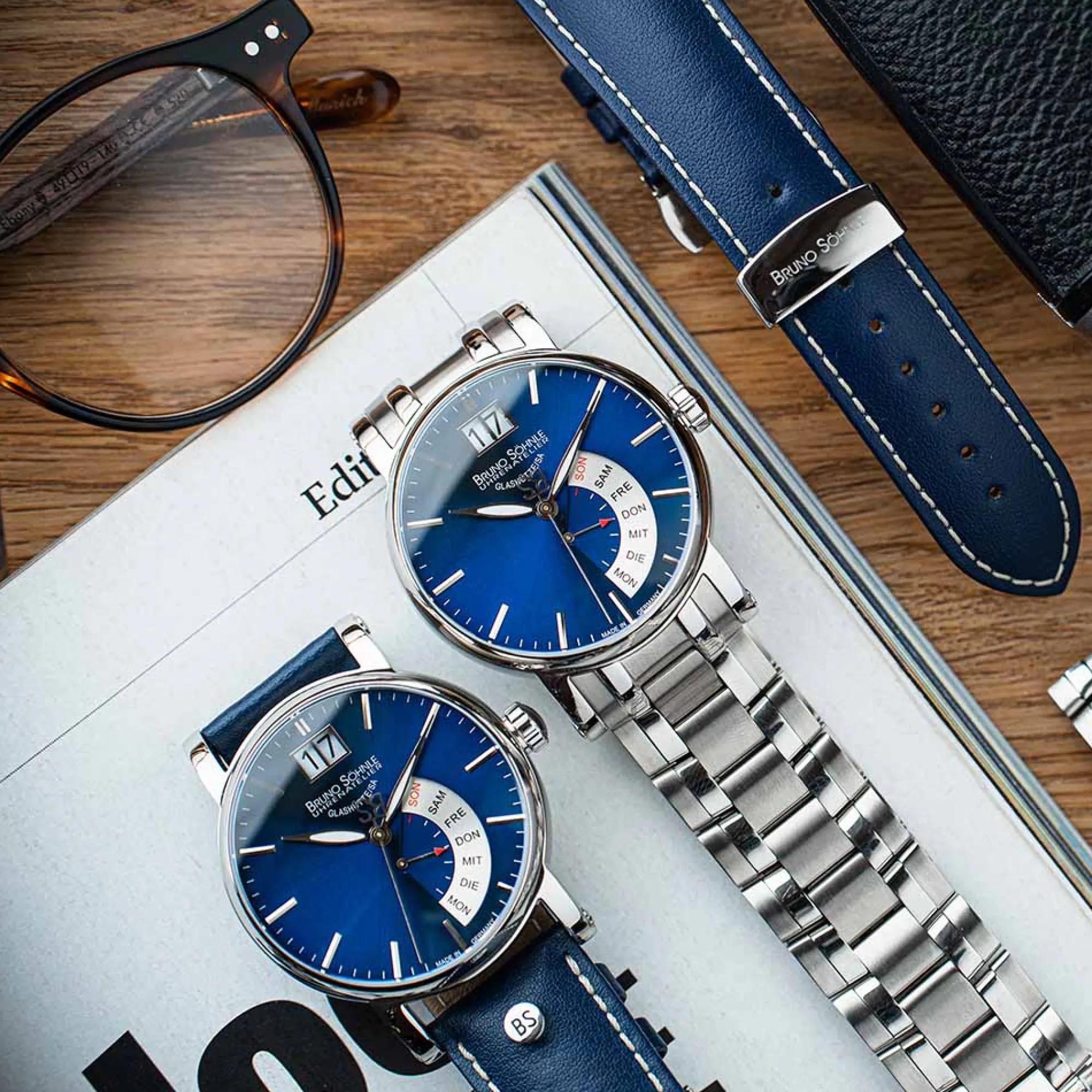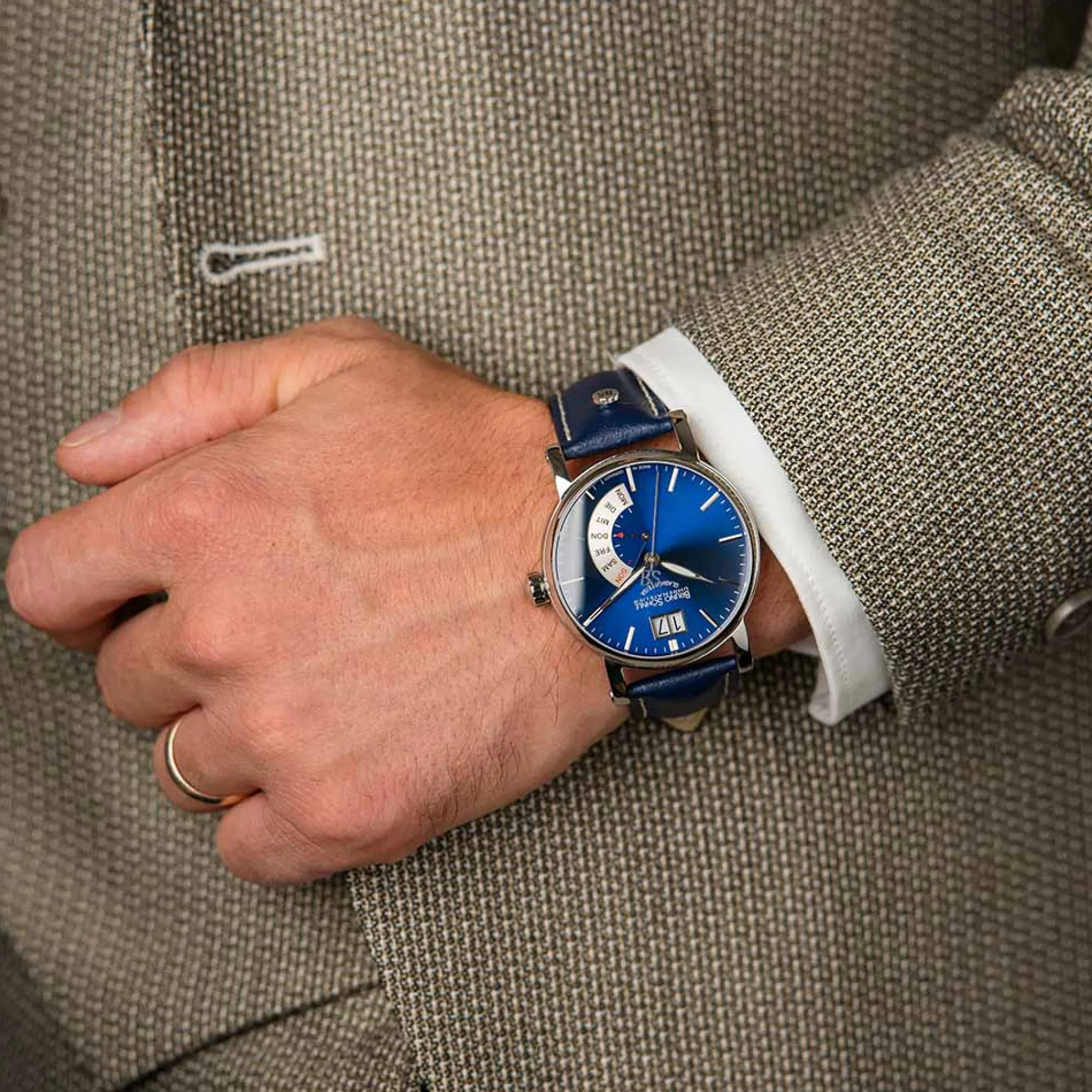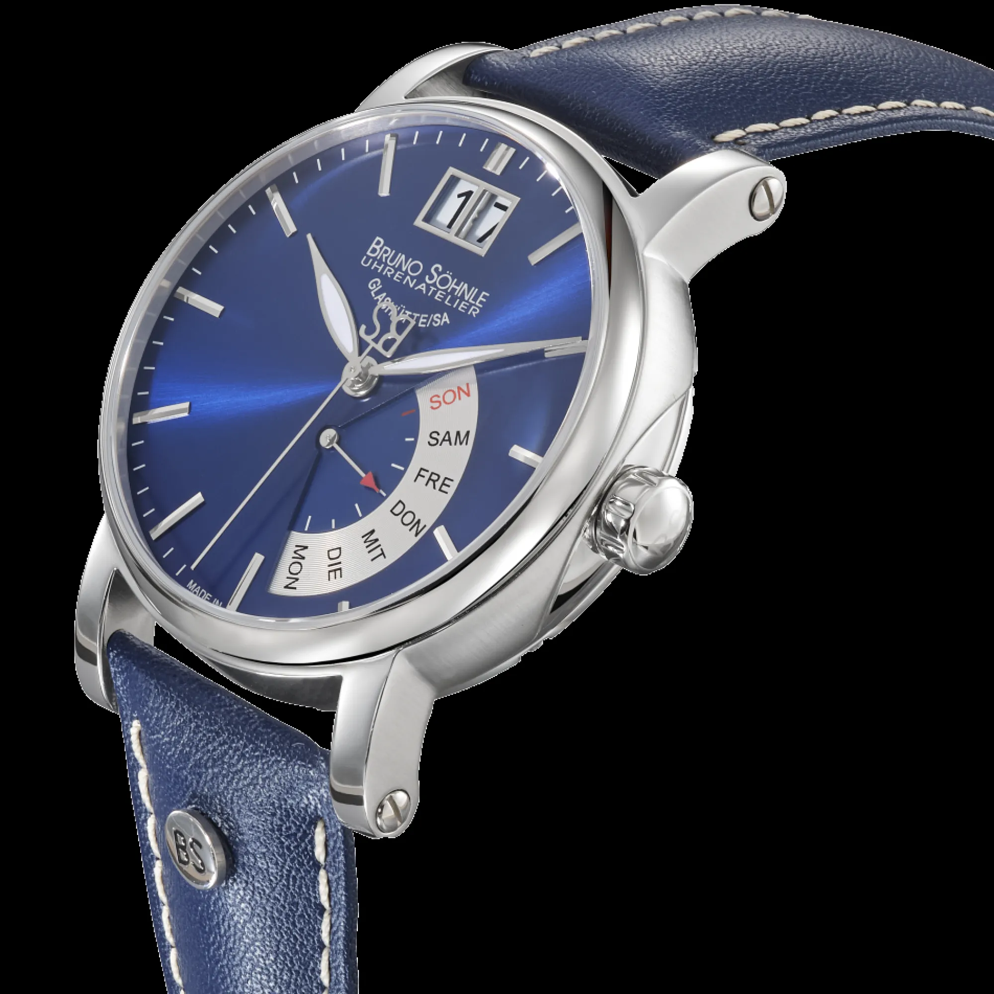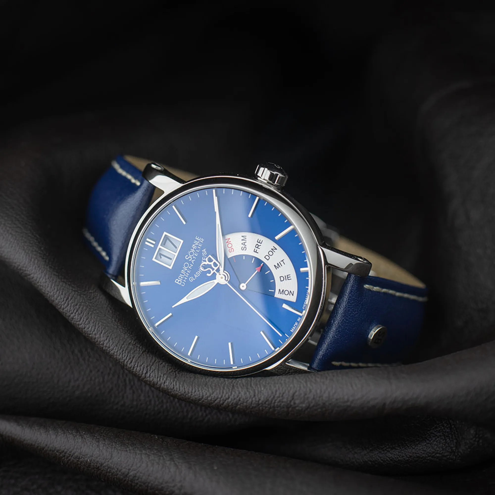 Quarzwerk In Veredelter Bruno Sohnle-Ausfuhrung (Basiswerk Ronda 7003.L), Gehause Edelstahl, O 43,0 Mm, Hohe 13,65 Mm, 10 Bar, Saphirglas Innen Entspiegelt, Kalbslederband Blau, Faltschliese