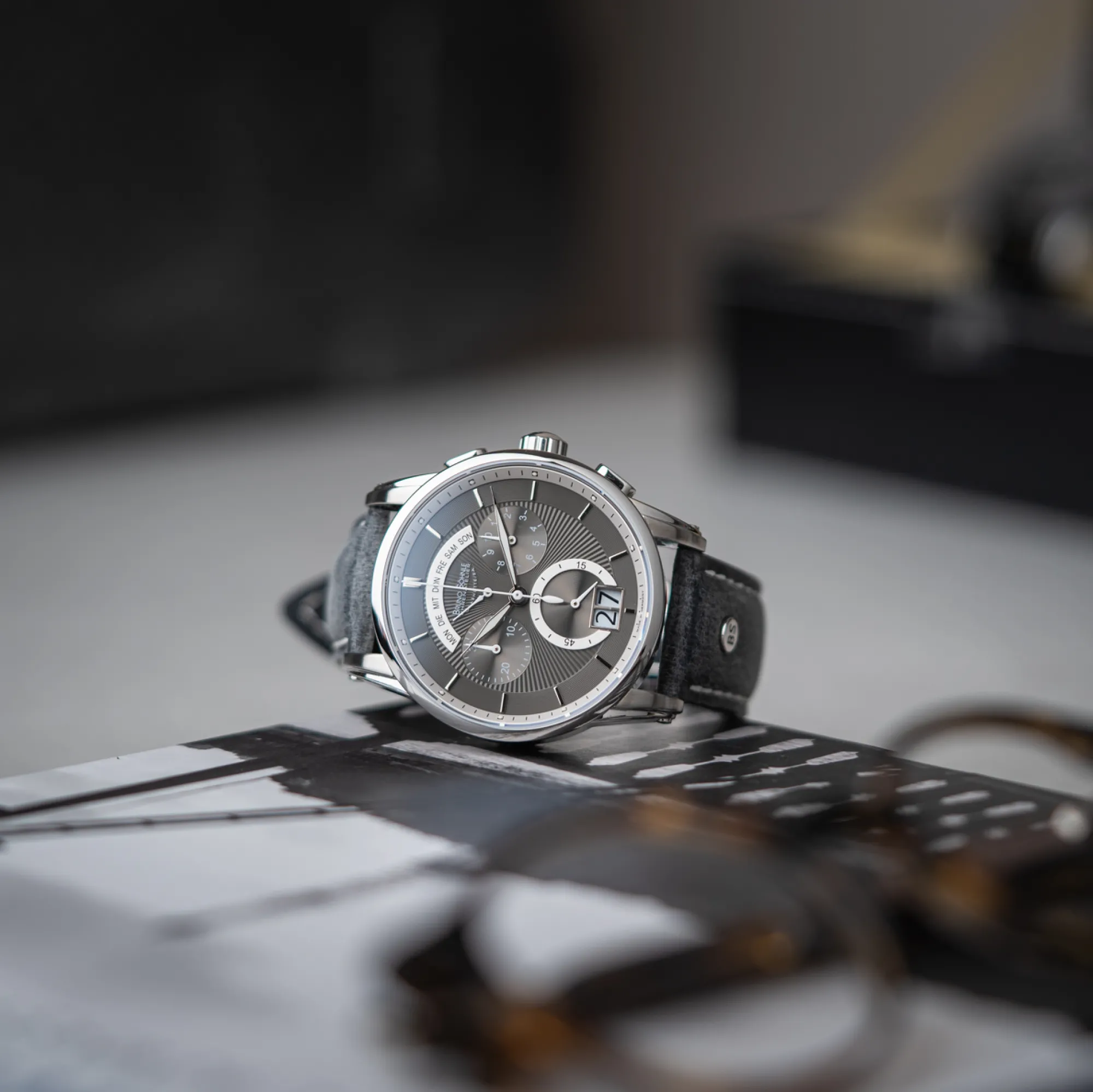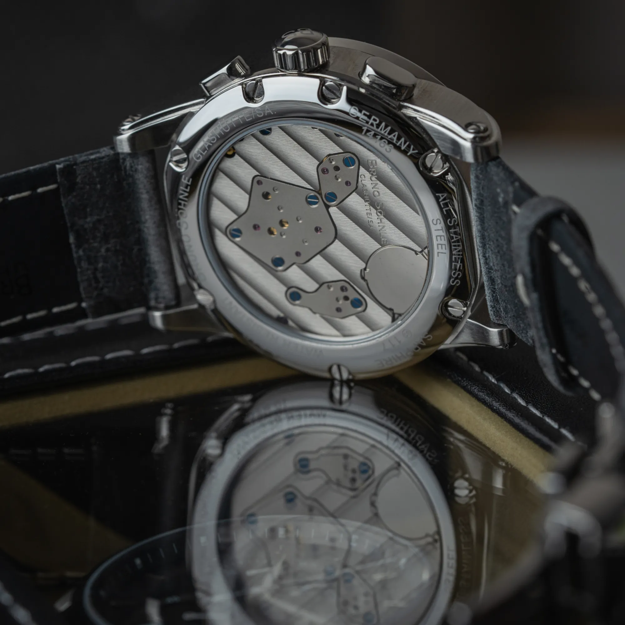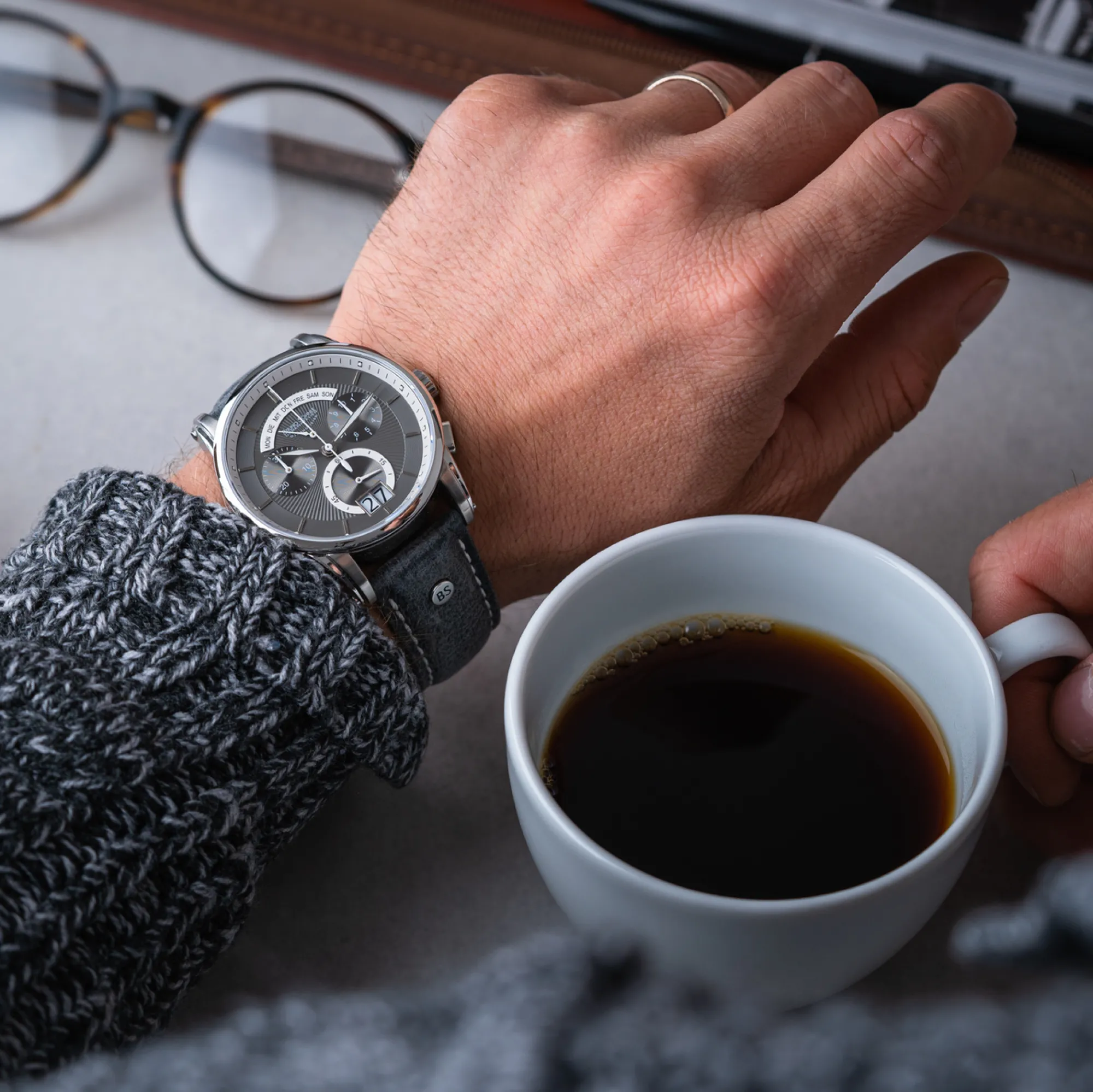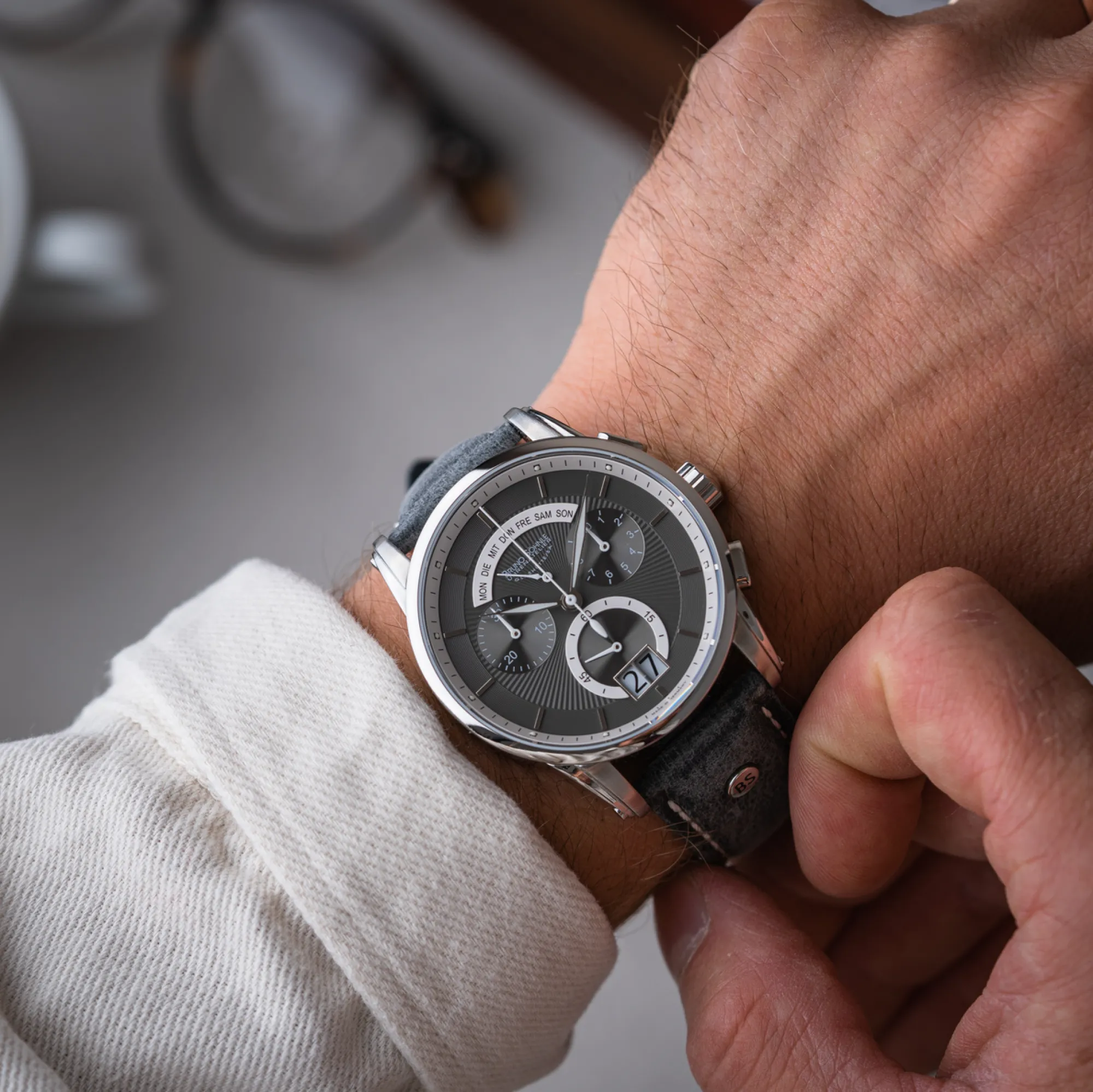Die Neue Bruno Sohnle Grandioso Bietet, Wie Fur Die Modellreihe Ublich, Sehr Viele Funktionen In Einer Uhr. Da Ware Das Grosdatum Auf 6 Uhr, Die Tagesanzeige Auf 12 Uhr Und Naturlich Die Chronographenfunktion Selbst. Das Verzierte Zifferblatt In Gedecktem Grauton Spielt Geradezu Mit Dem Licht Und Passt Hervorragend Zu Dem Grauen Lederarmband.