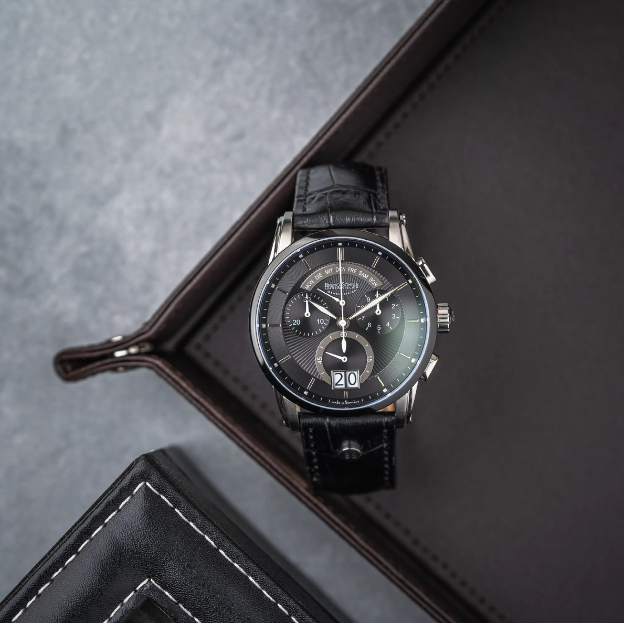 Quarzwerk In Veredelter Bruno Sohnle-Ausfuhrung (Basiswerk Ronda 8040.N), Edelstahl Bicolor Ip Schwarz, O 42,5 Mm, Hohe 12,8 Mm, 10 Bar, Saphirglas Innen Entspiegelt, Rindsleder Schwarz, Faltschliese