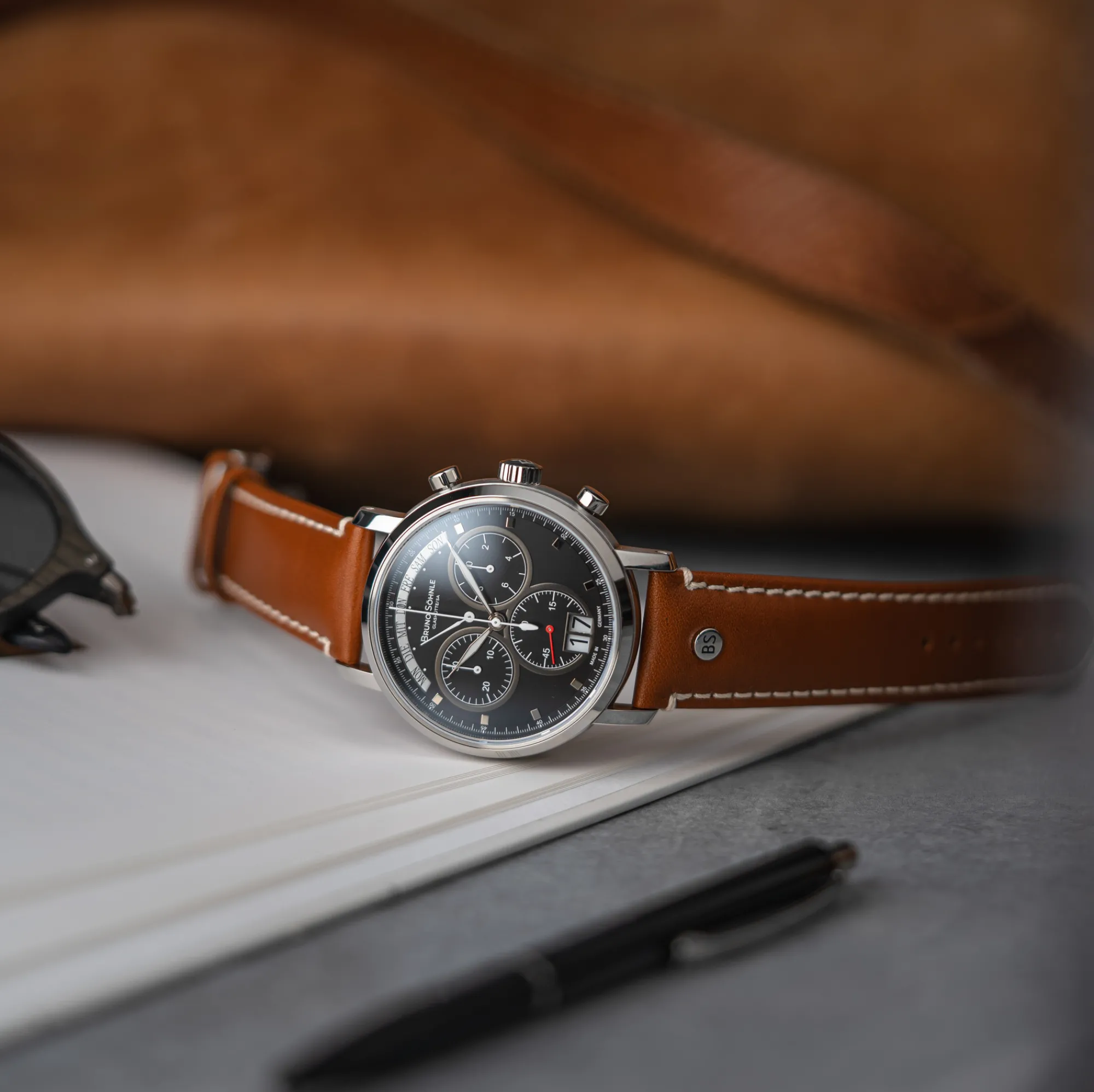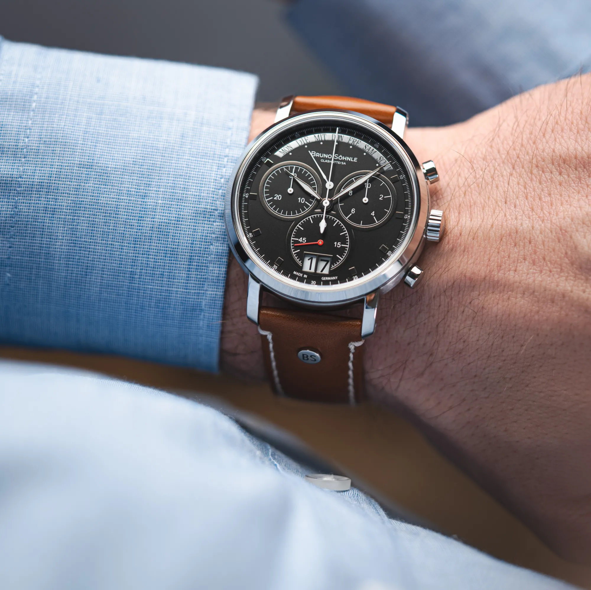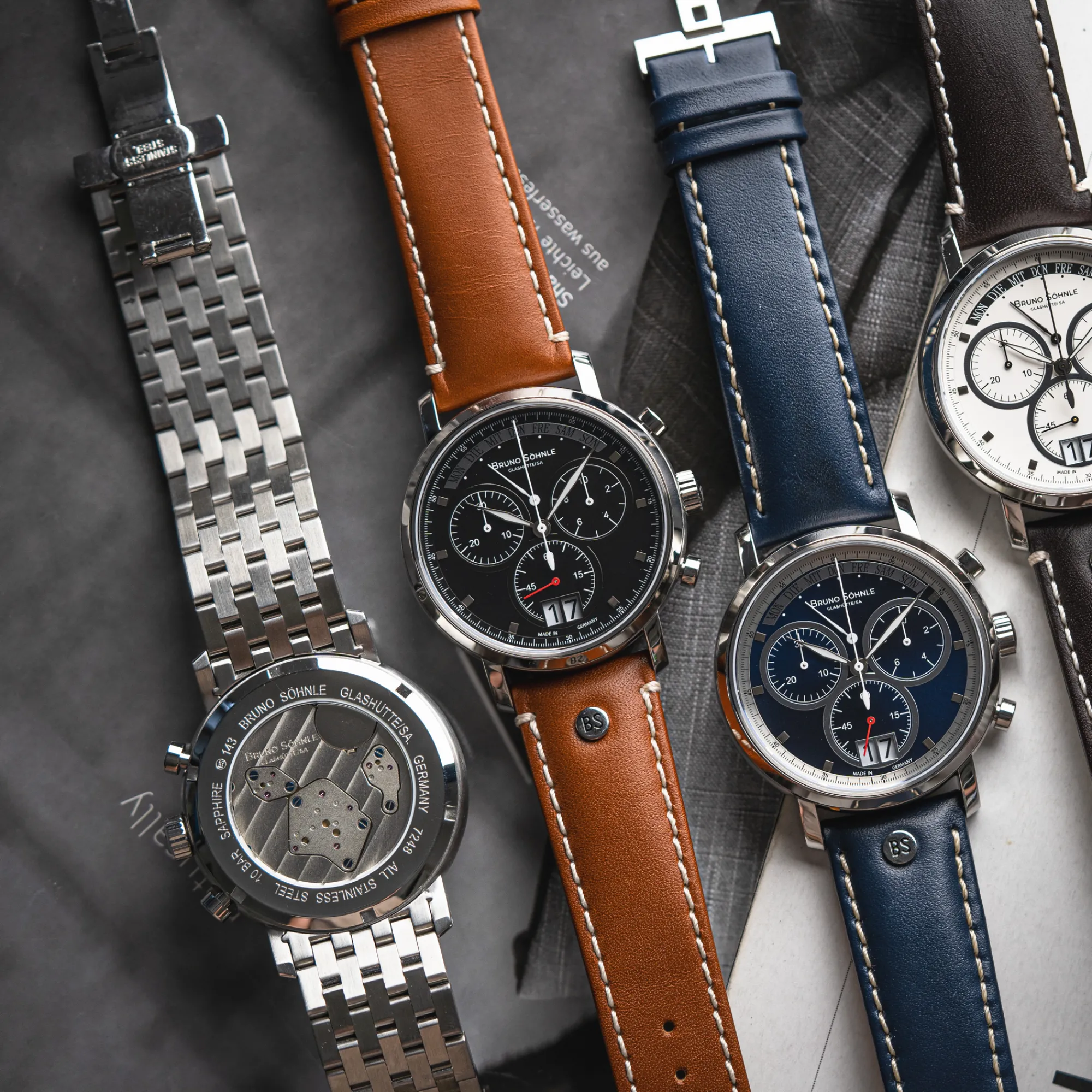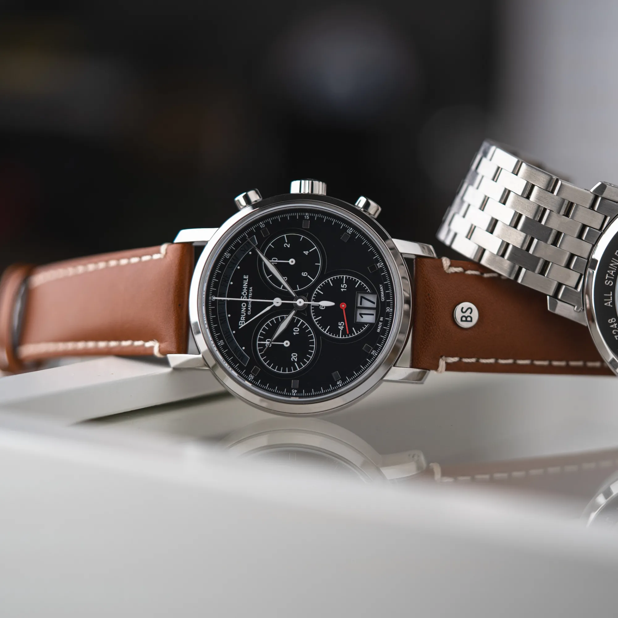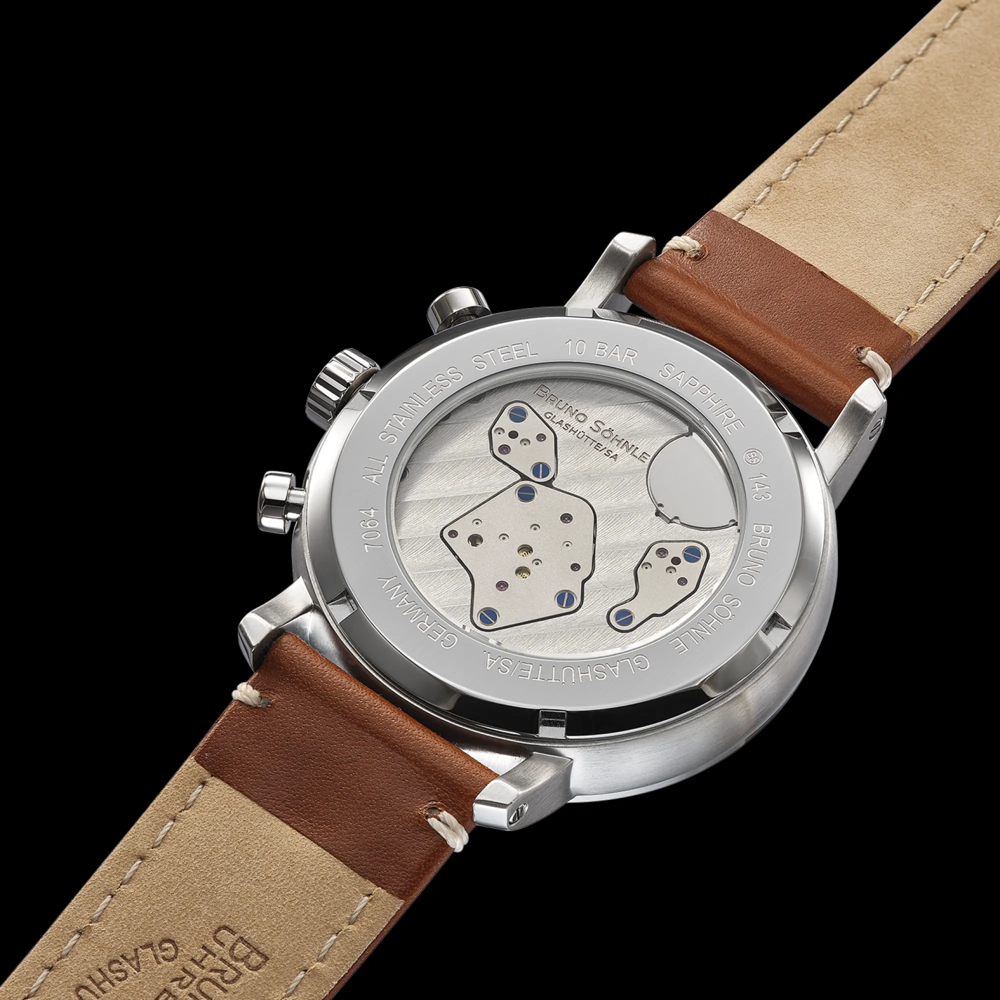 Quarzwerk In Veredelter Bruno Sohnle-Ausfuhrung (Basiswerk Ronda 8040.N), Edelstahl, O 44,0 Mm, Hohe 12,0 Mm, 10 Bar, Saphirglas Innen Entspiegelt, Kalbsleder Mittelbraun, Faltschliese
