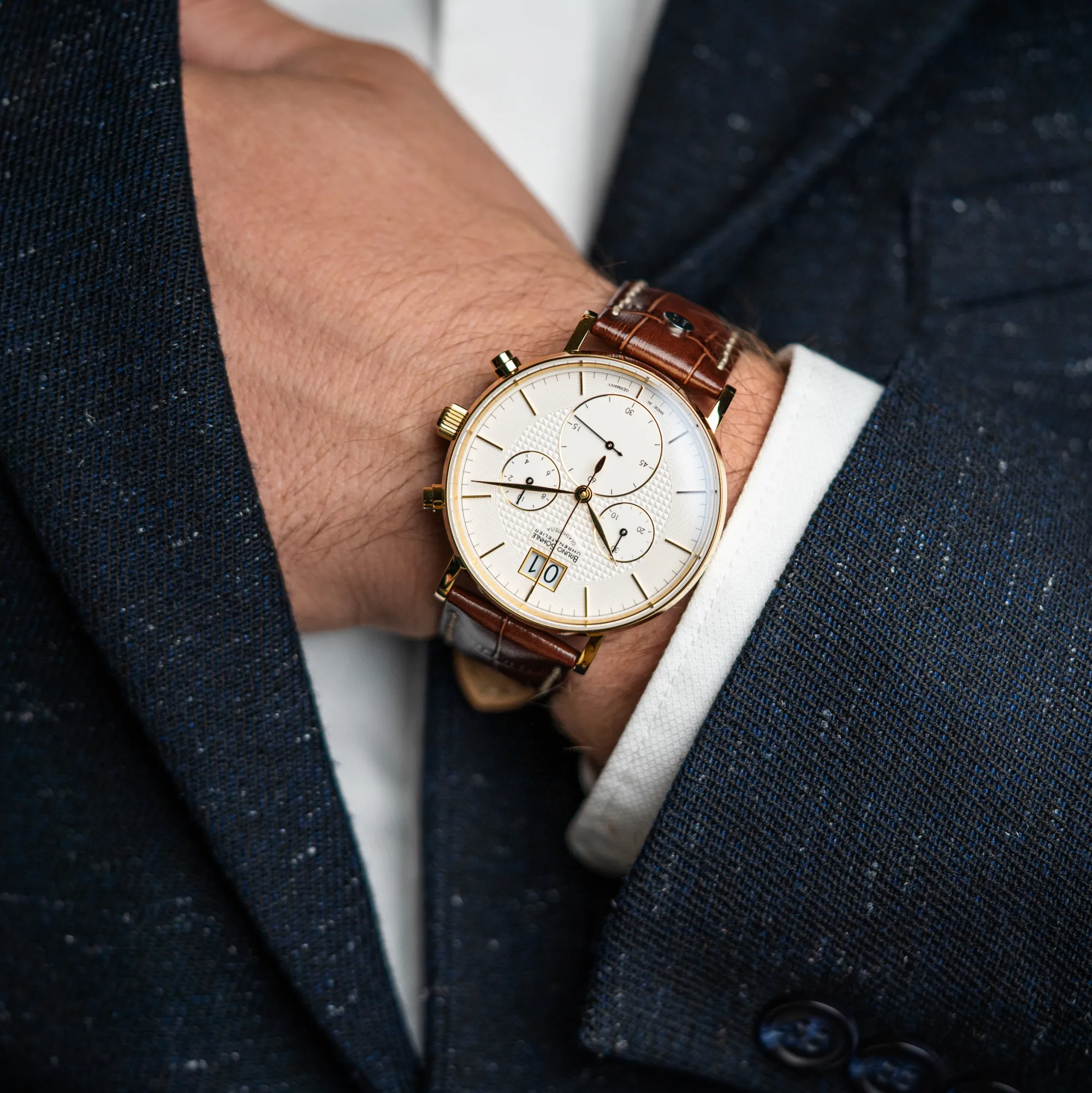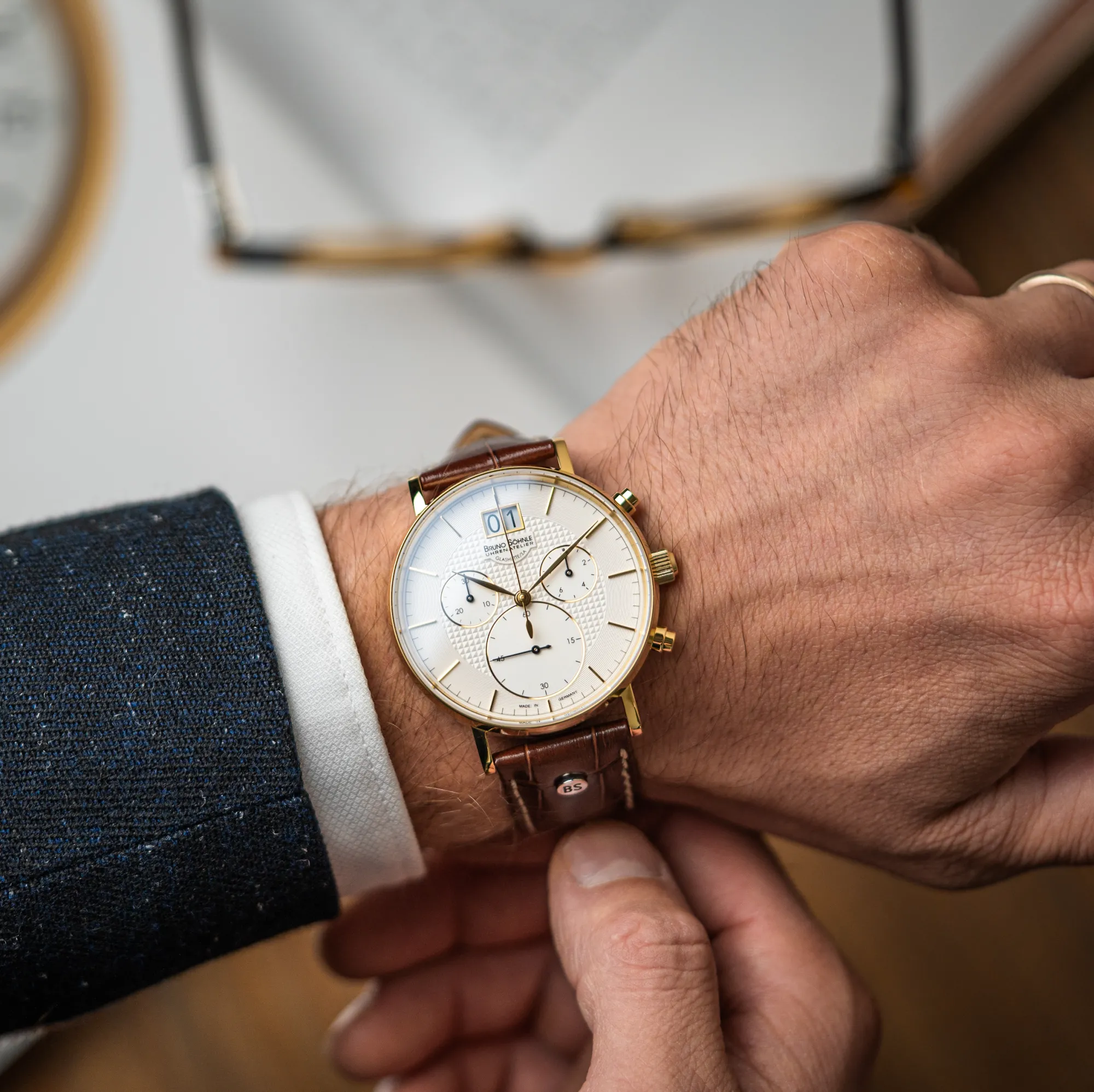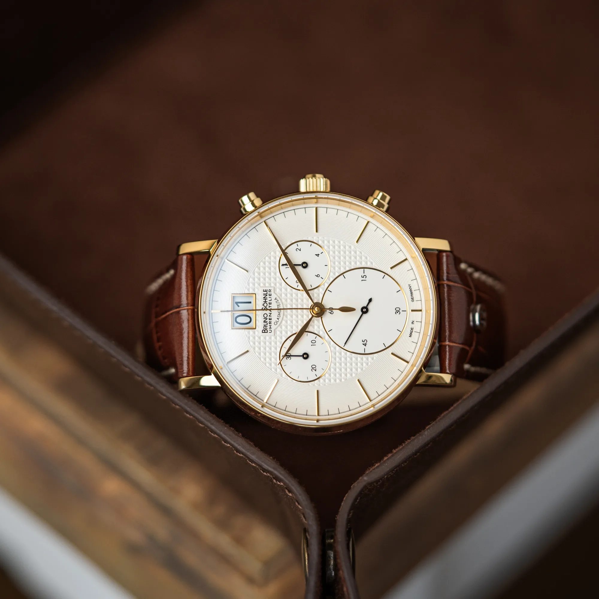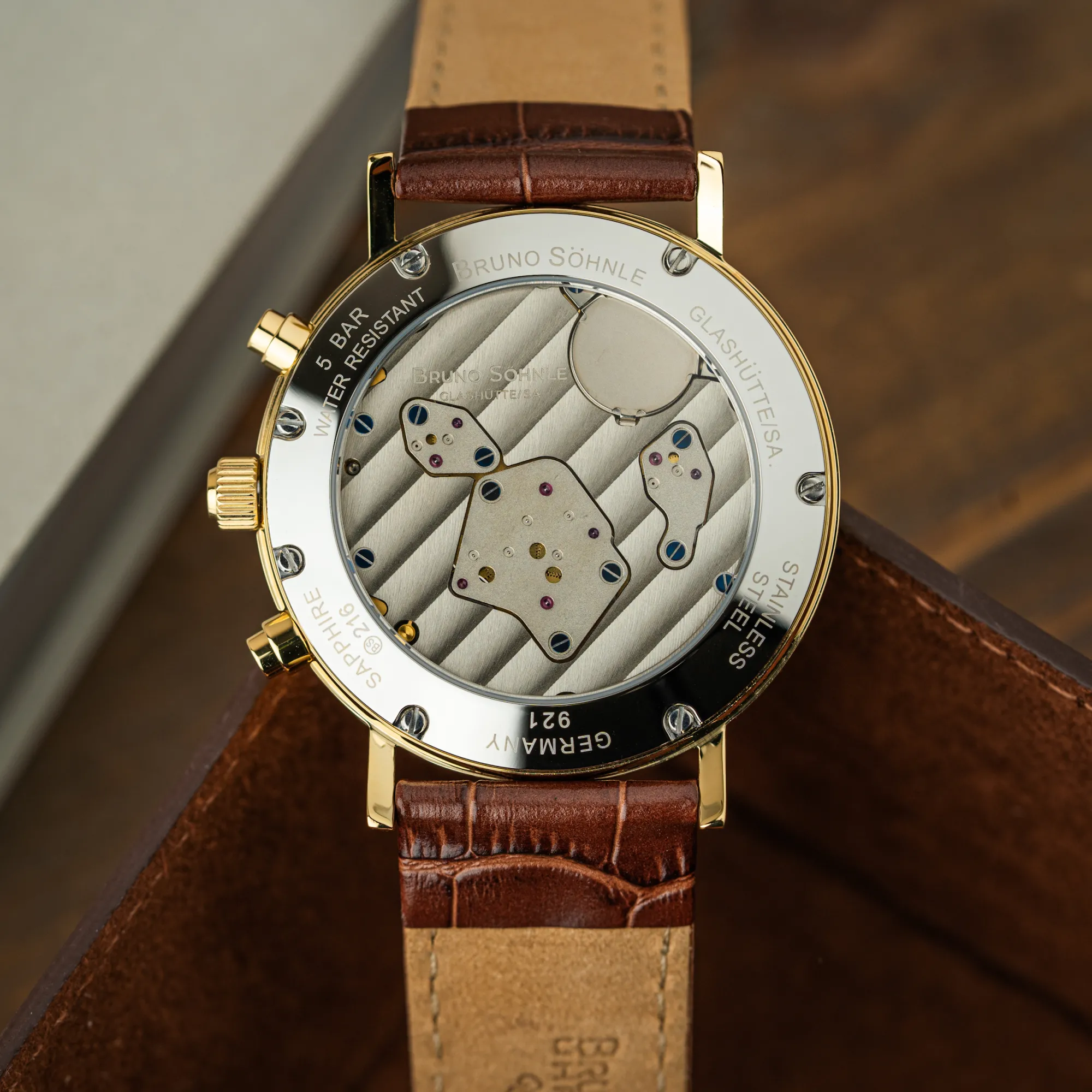 Quarzwerk In Veredelter Bruno Sohnle-Ausfuhrung (Basiswerk Ronda 8040.B), Edelstahl Ip Gold, O 43,0 Mm, Hohe 12,9 Mm, 5 Bar, Saphirglas Innen Entspiegelt, Kalbsleder Dunkelbraun, Faltschliese