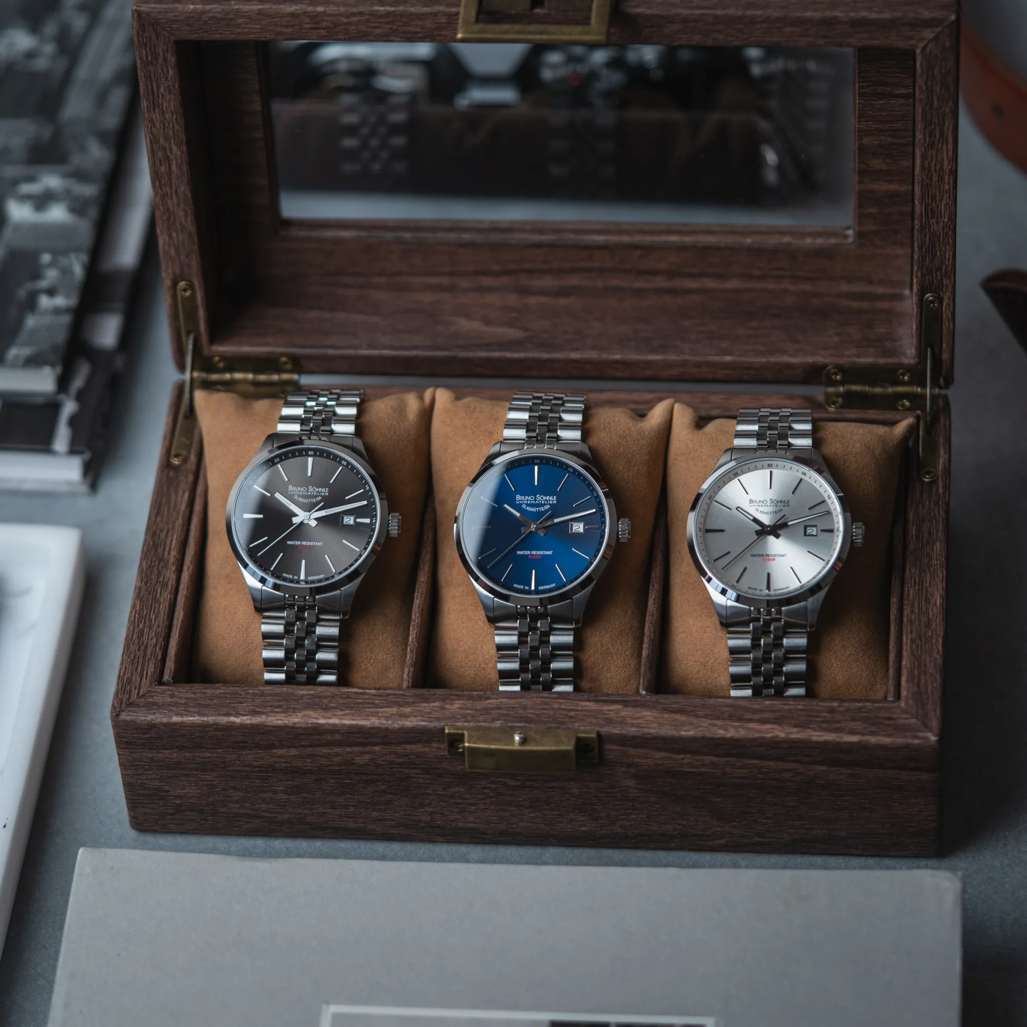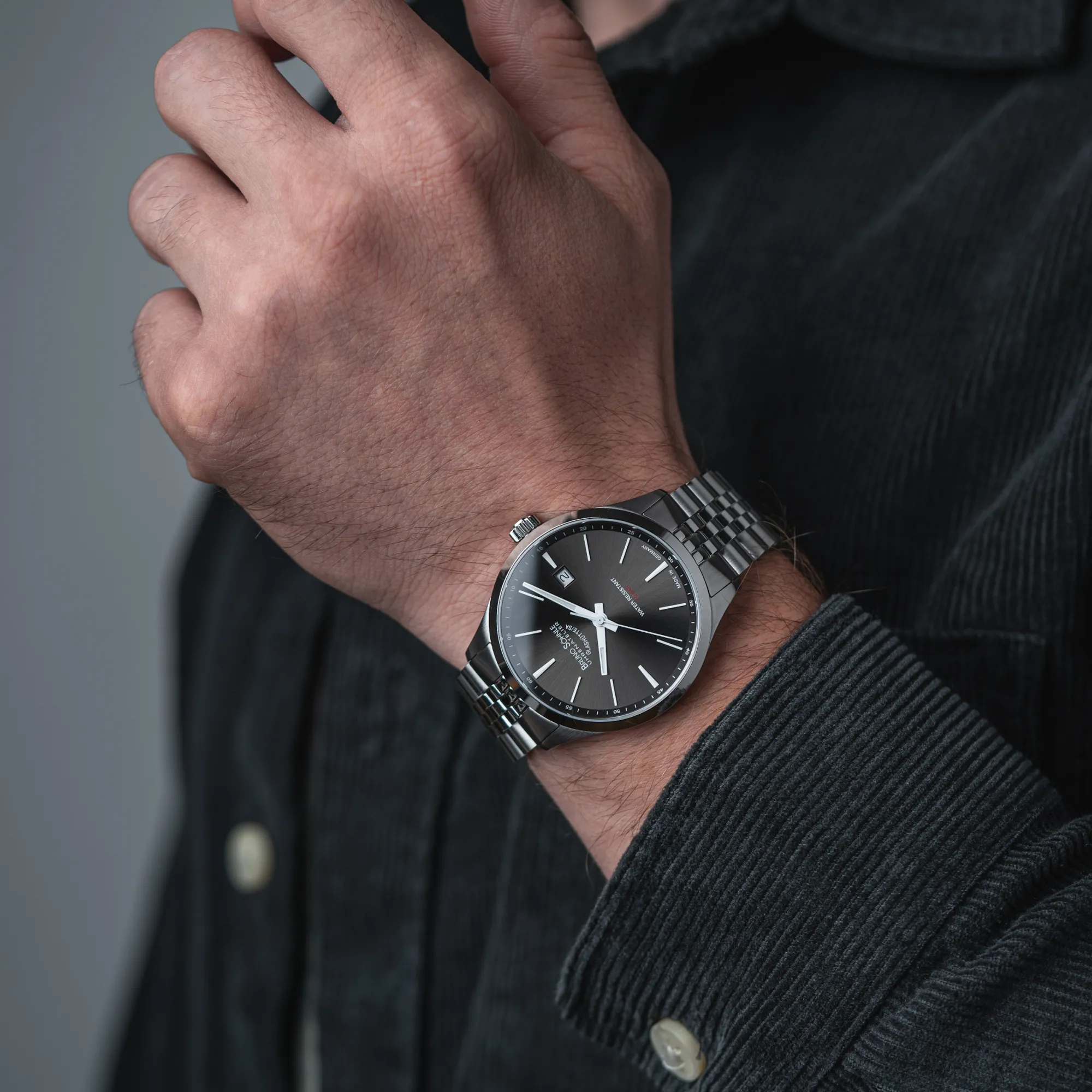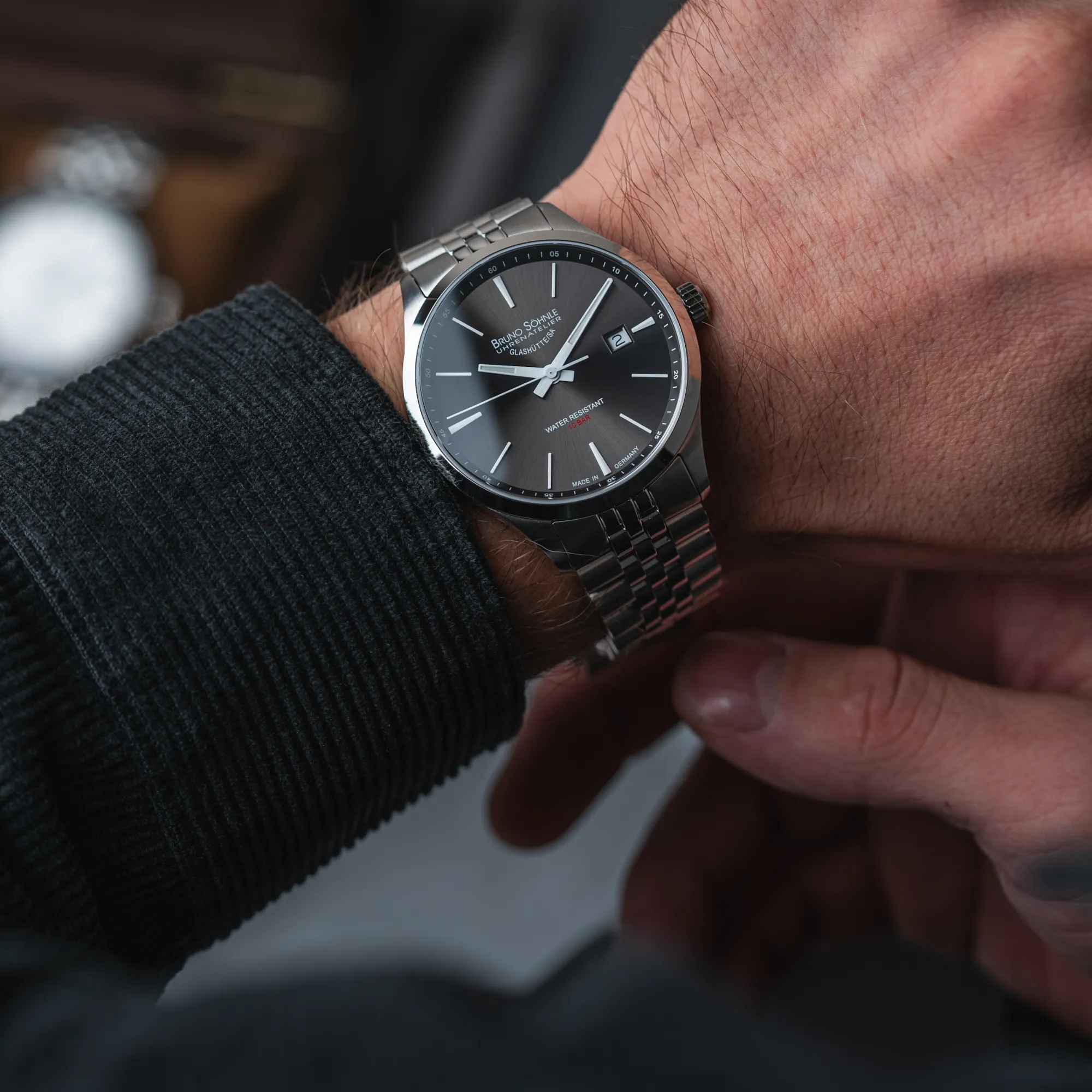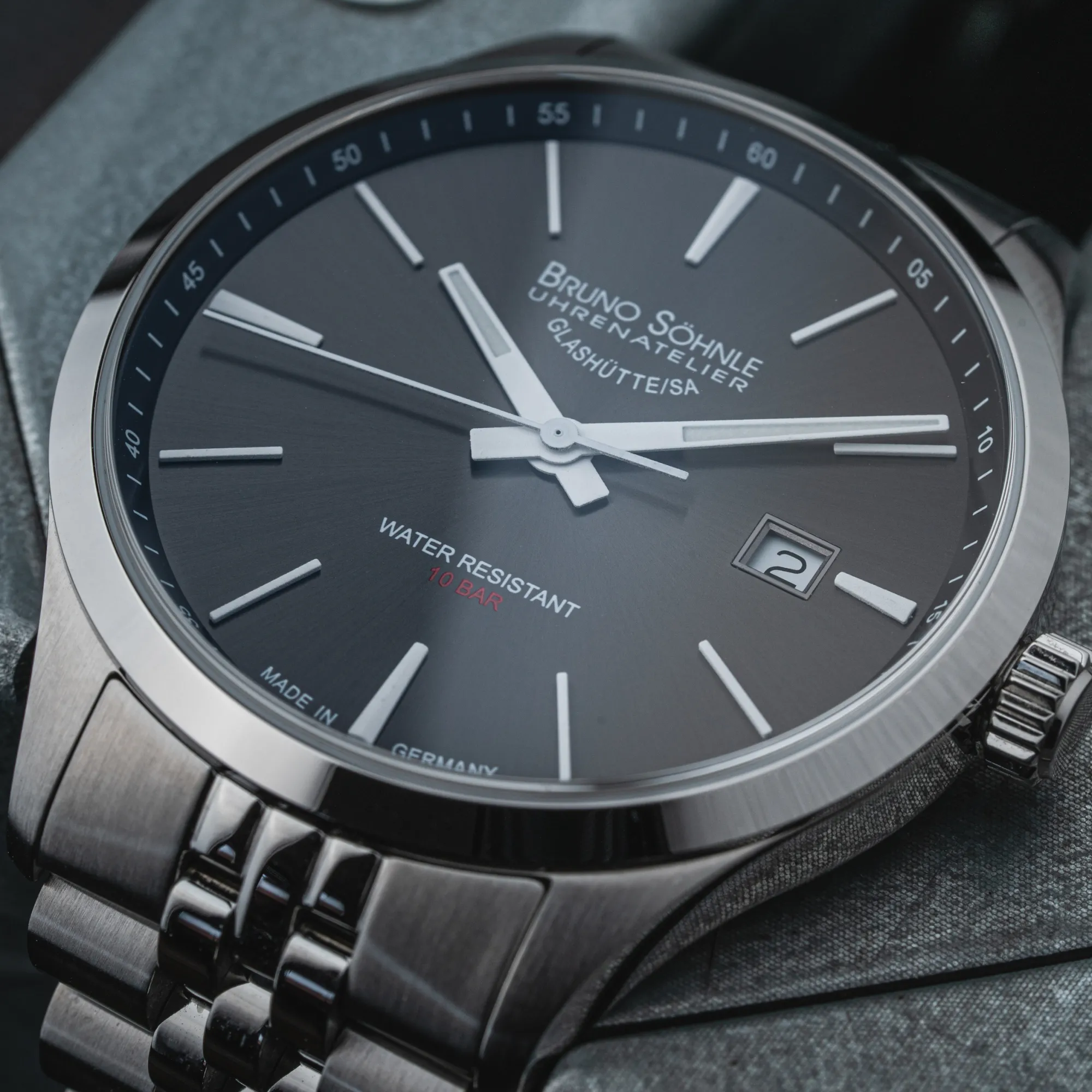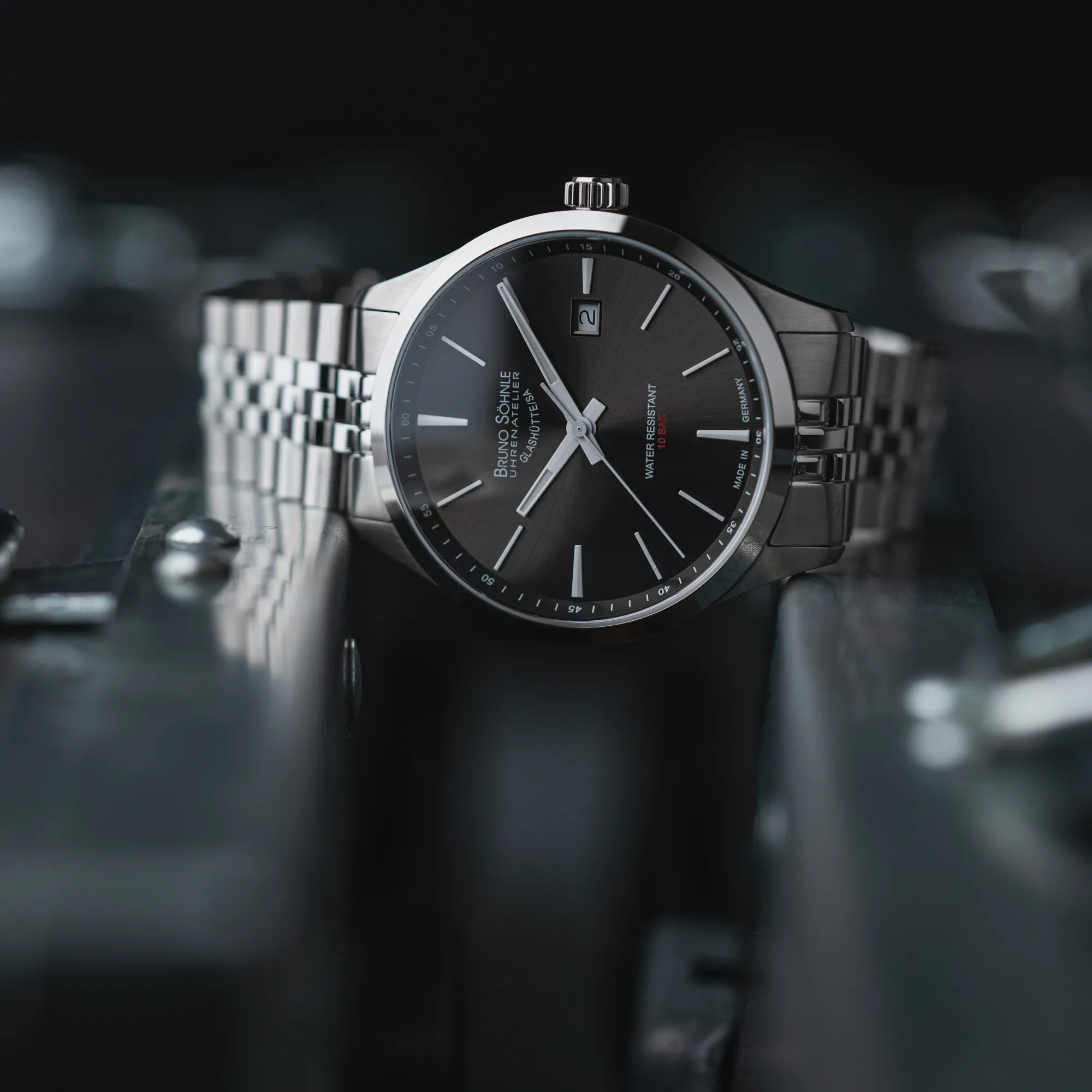 Quarzwerk In Veredelter Bruno Sohnle-Ausfuhrung (Basiswerk Ronda 6003.D), Gehause Edelstahl, Zifferblatt Grau, O 41,0 Mm, Hohe 9,5 Mm, 10 Bar, Saphirglas Innen Entspiegelt, Metallband Edelstahl, Faltschliese