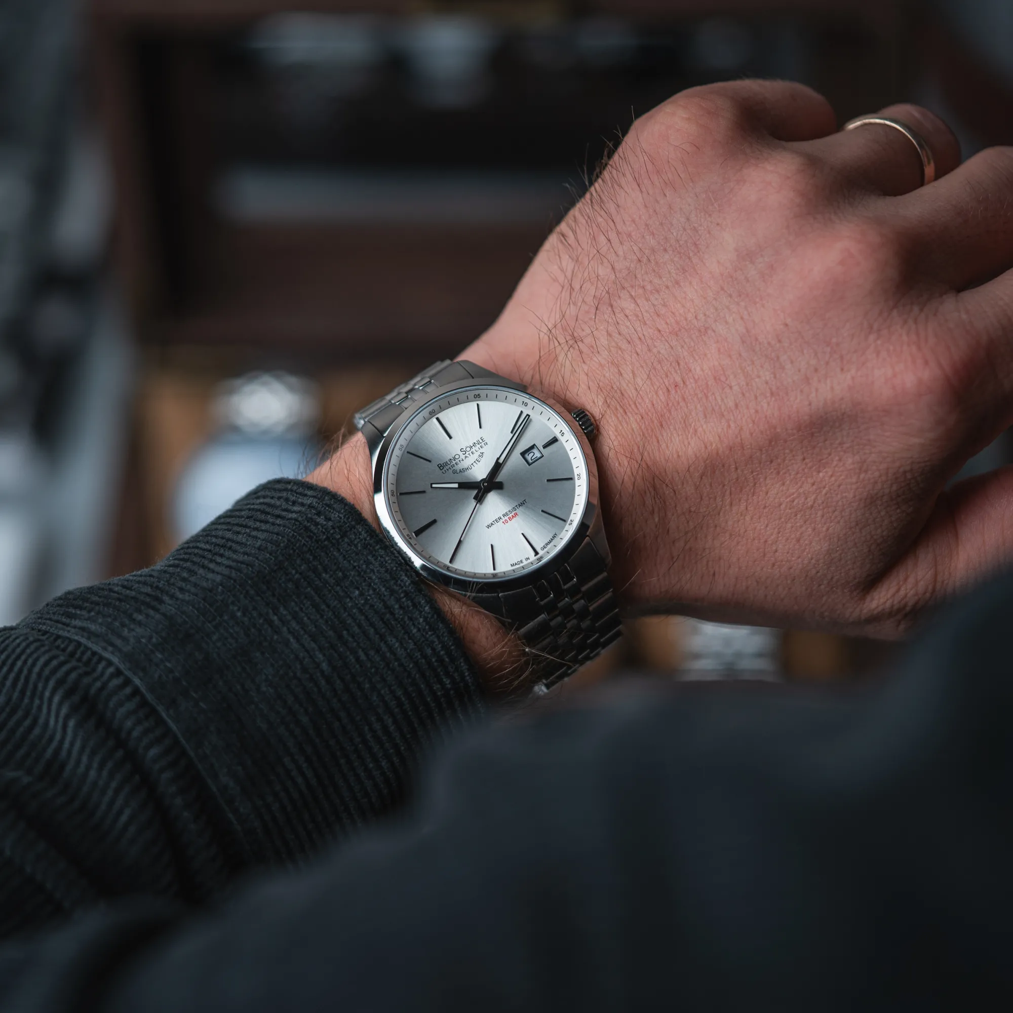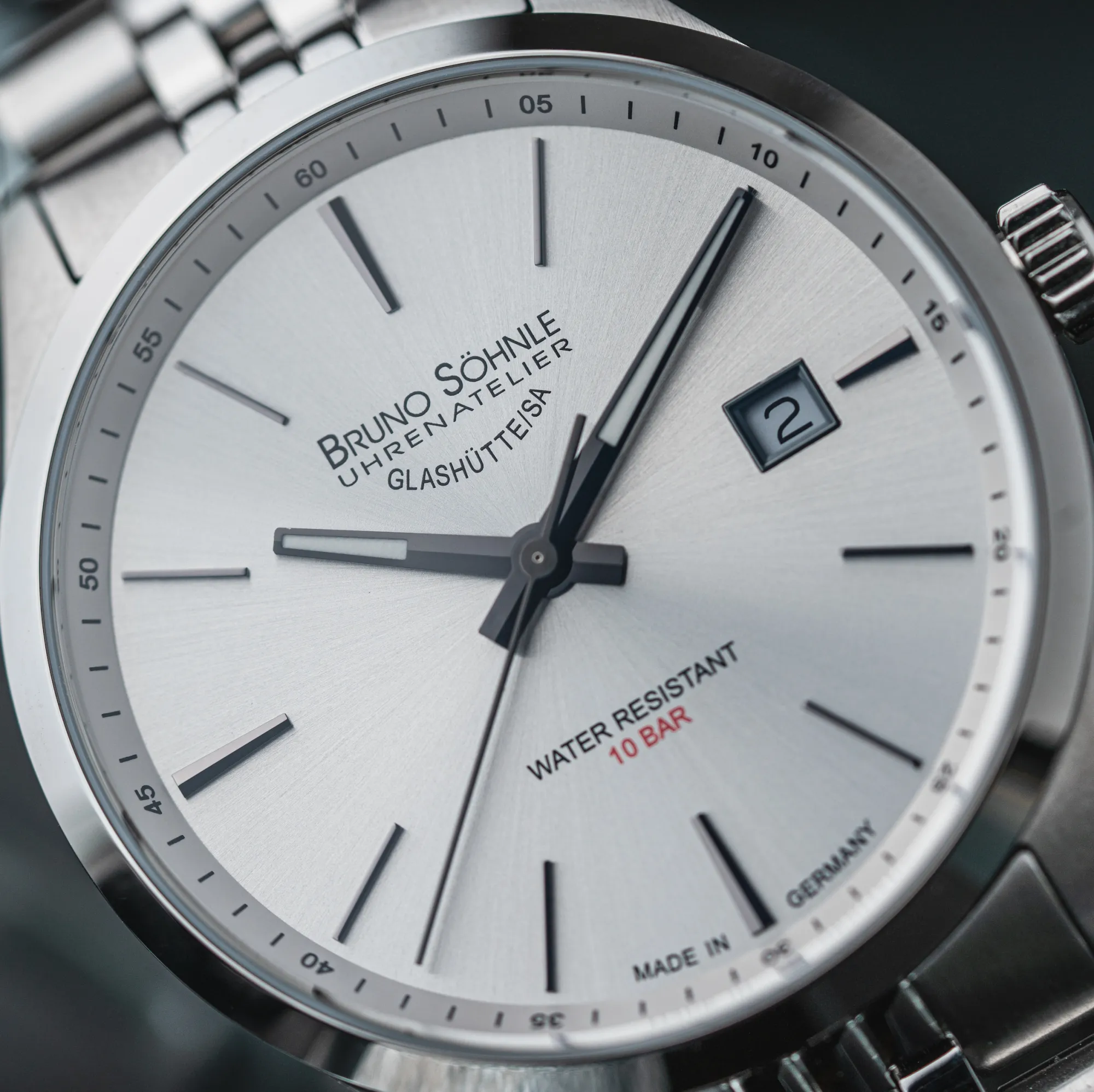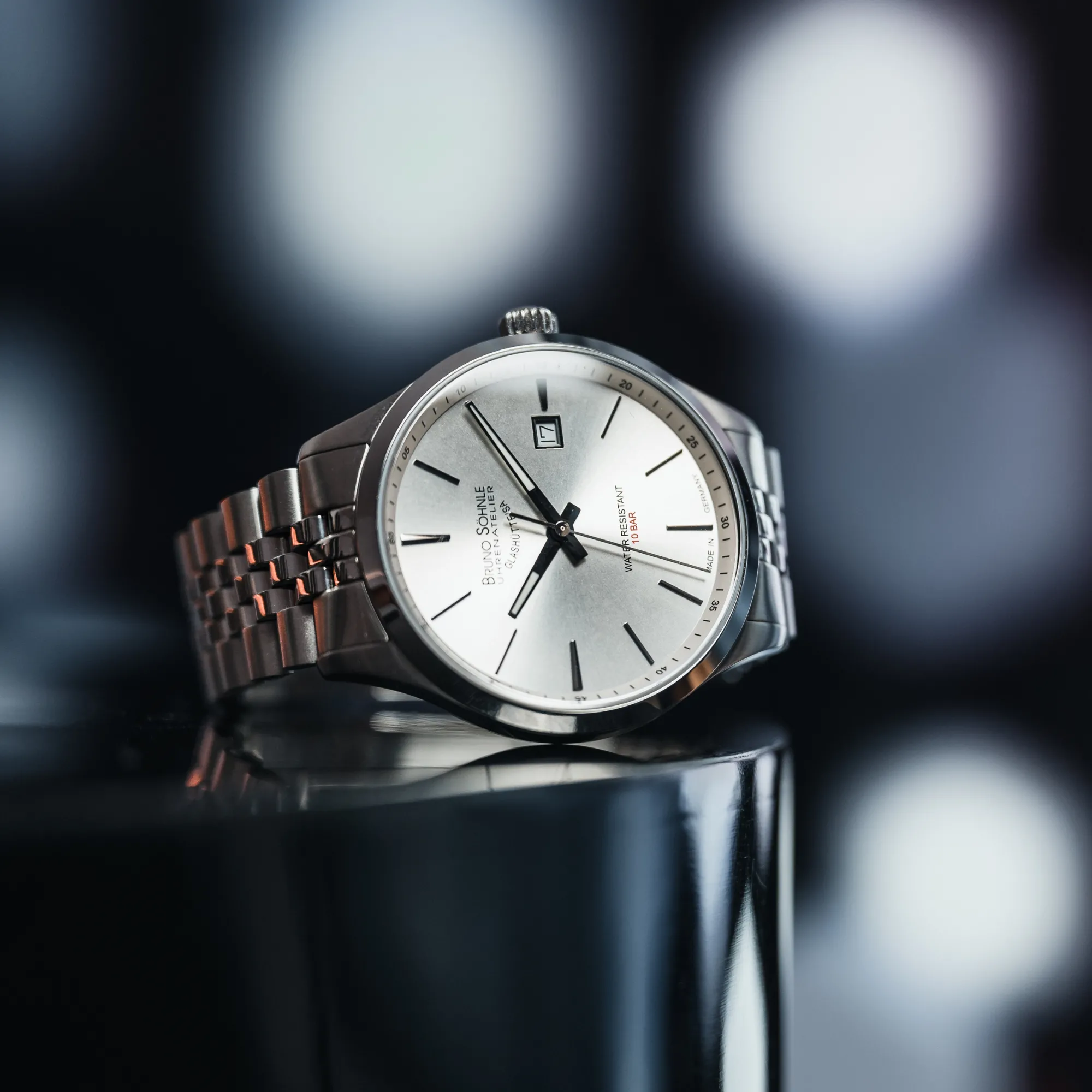 Quarzwerk In Veredelter Bruno Sohnle-Ausfuhrung (Basiswerk Ronda 6003.D), Gehause Edelstahl, Zifferblatt Silber, O 41,0 Mm, Hohe 9,5 Mm, 10 Bar, Saphirglas Innen Entspiegelt, Metallband Edelstahl, Faltschliese