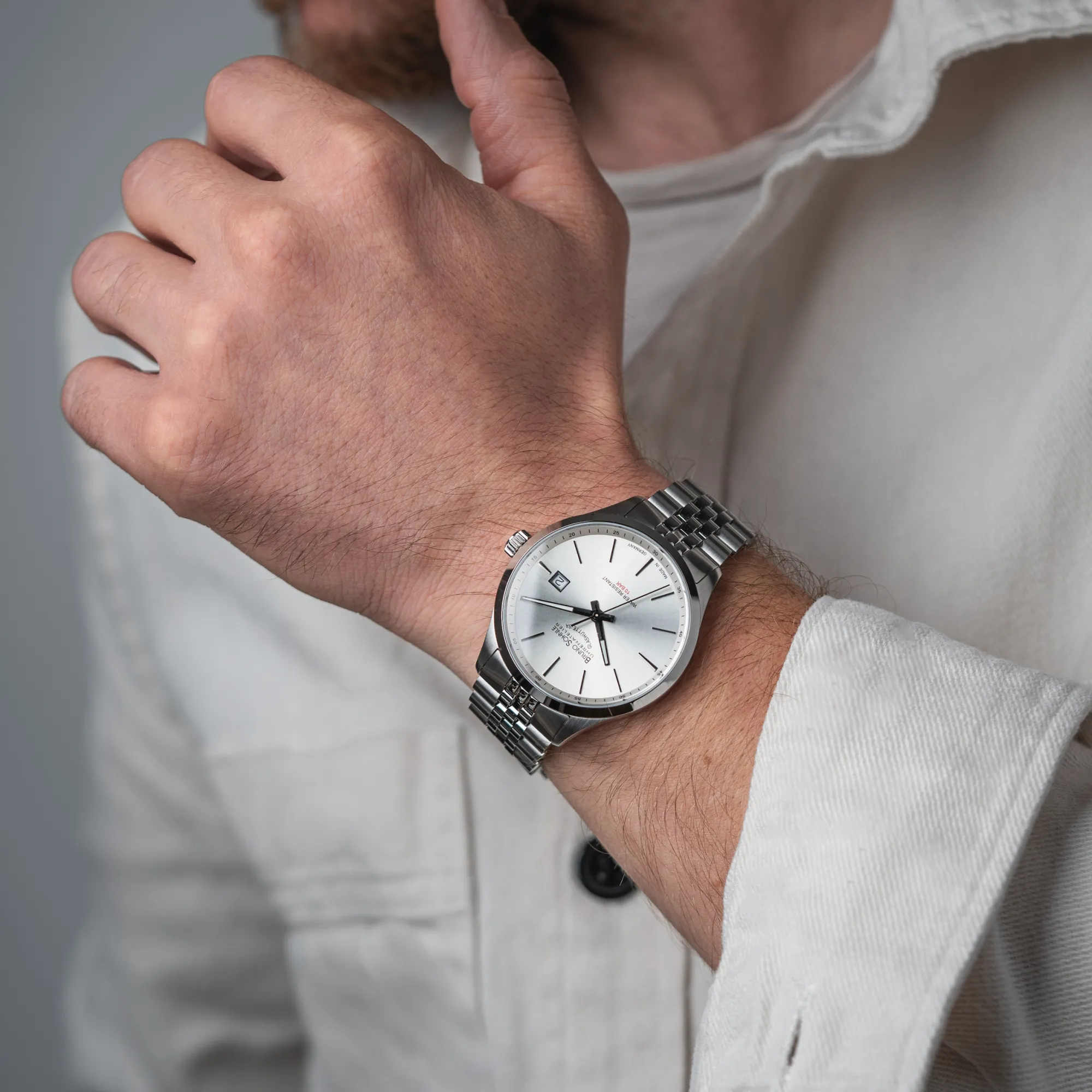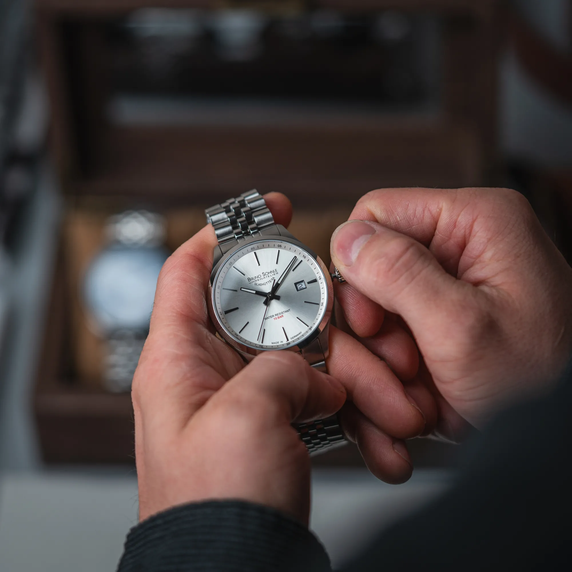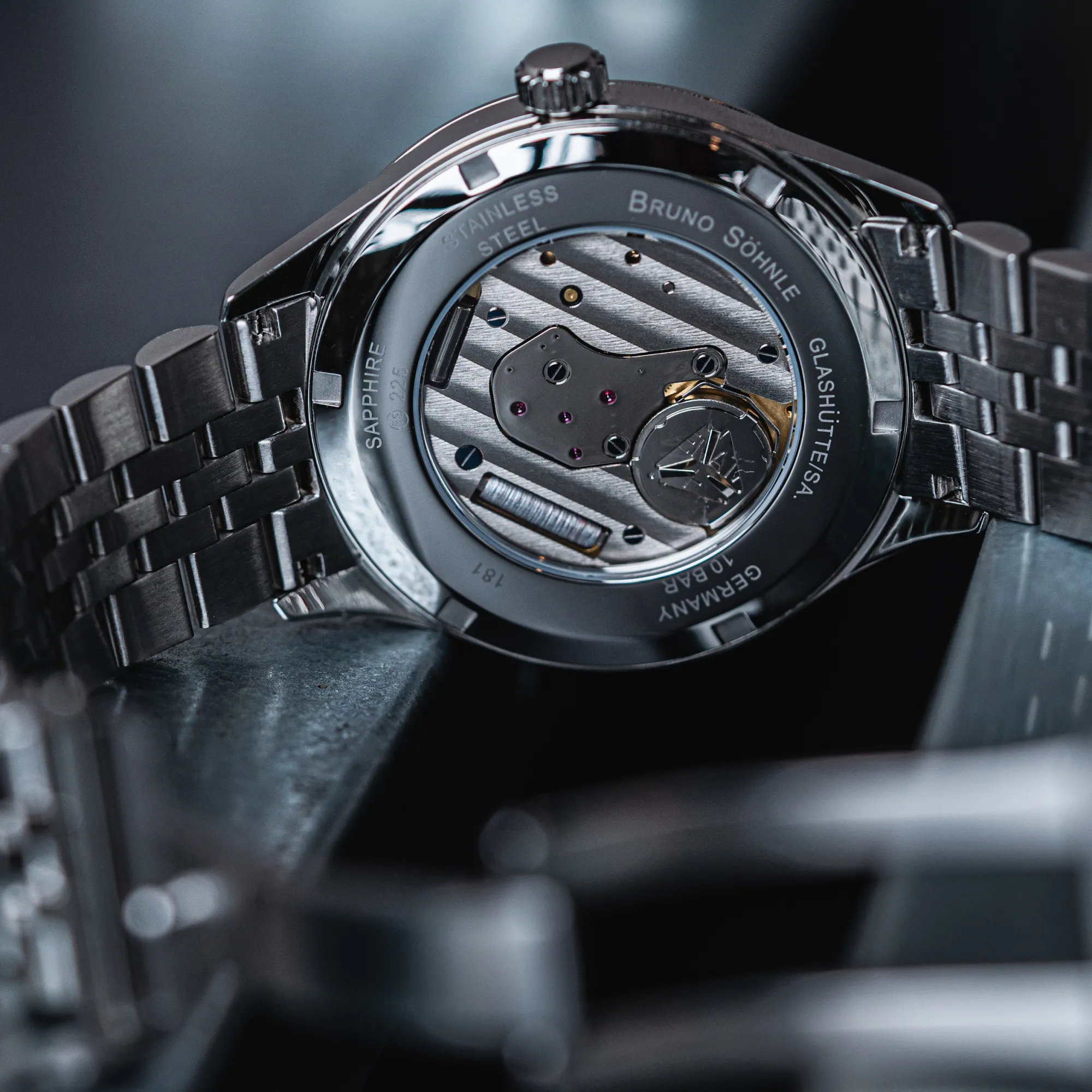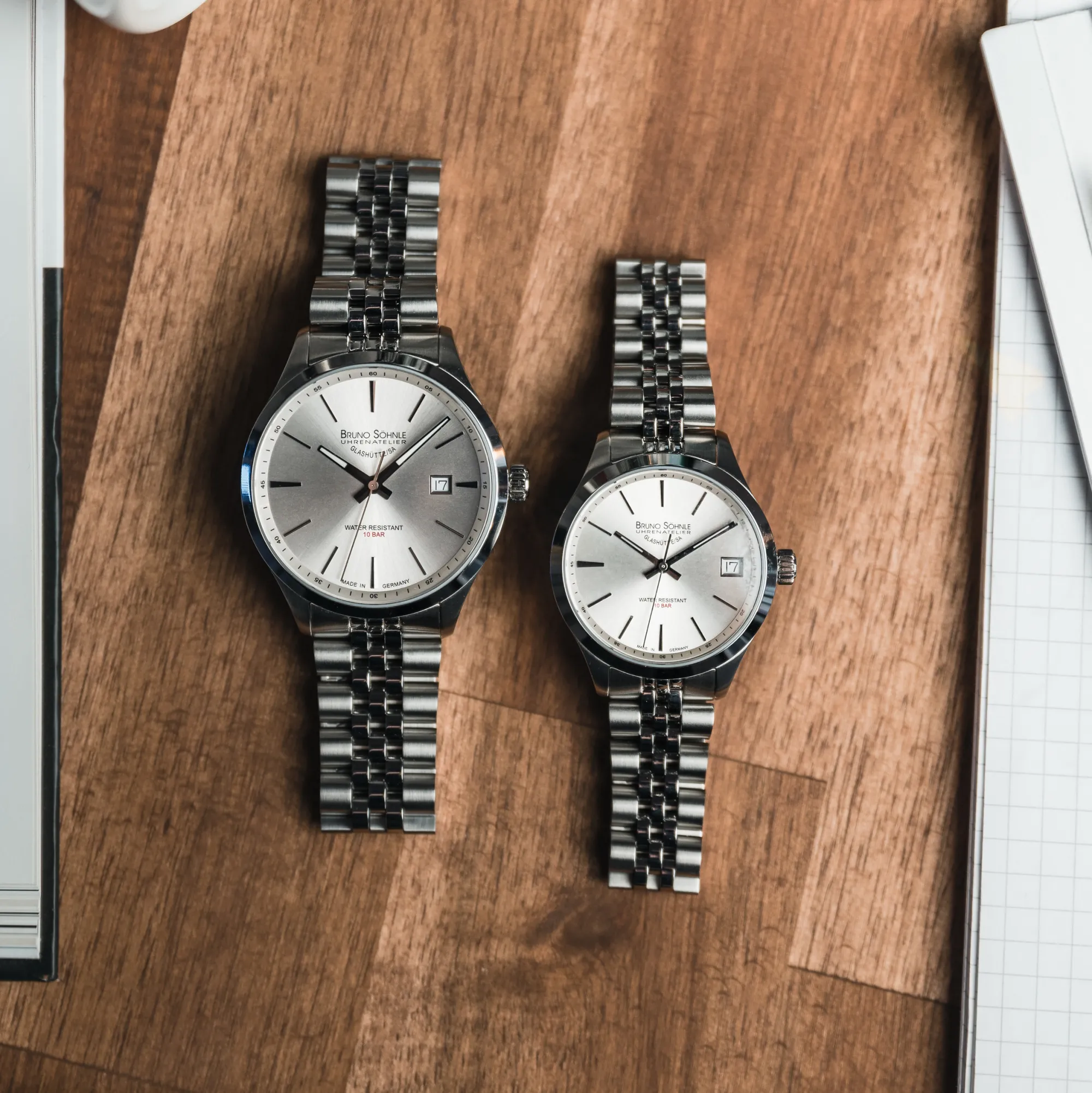 Quarzwerk In Veredelter Bruno Sohnle-Ausfuhrung (Basiswerk Ronda 6003.D), Gehause Edelstahl, Zifferblatt Silber, O 41,0 Mm, Hohe 9,5 Mm, 10 Bar, Saphirglas Innen Entspiegelt, Metallband Edelstahl, Faltschliese